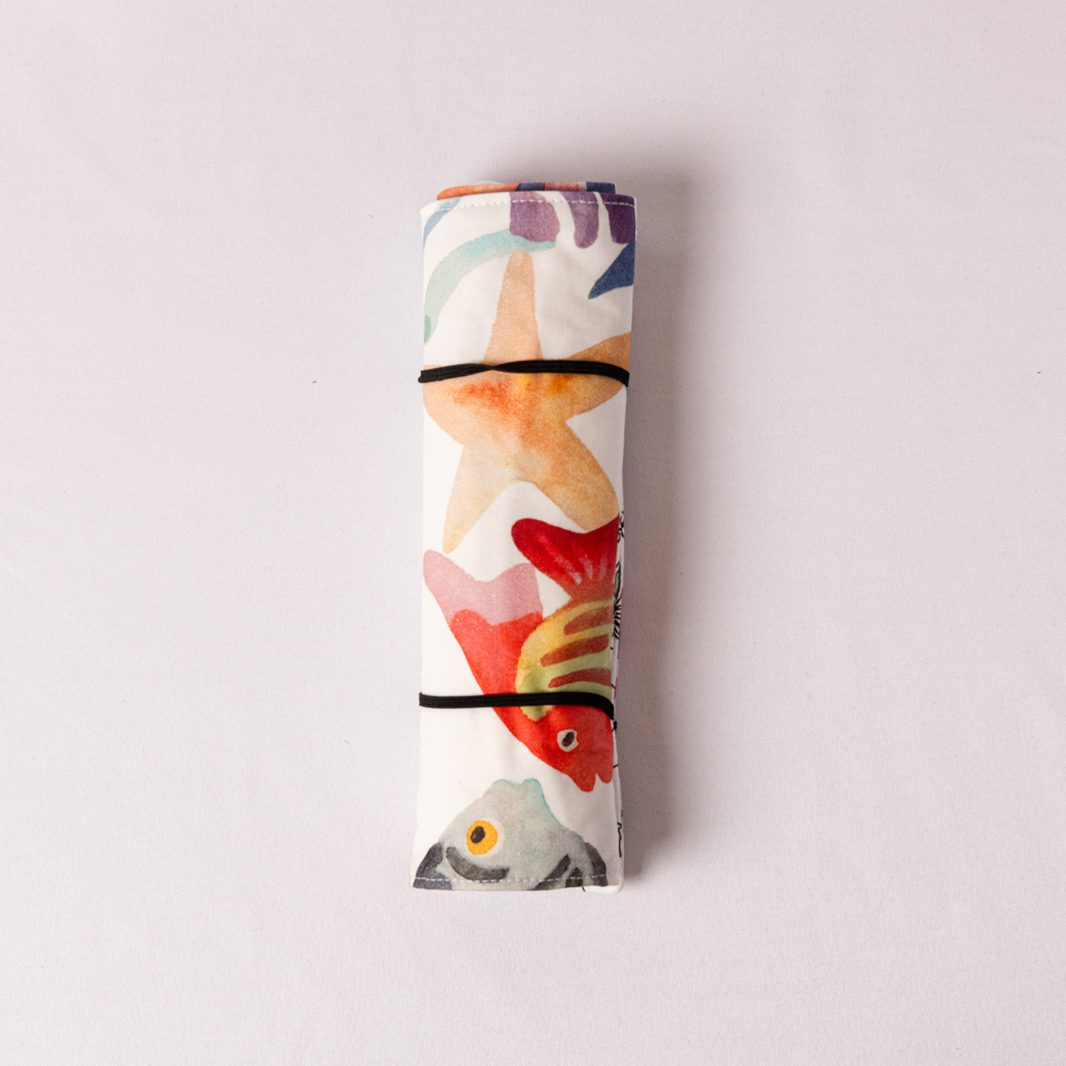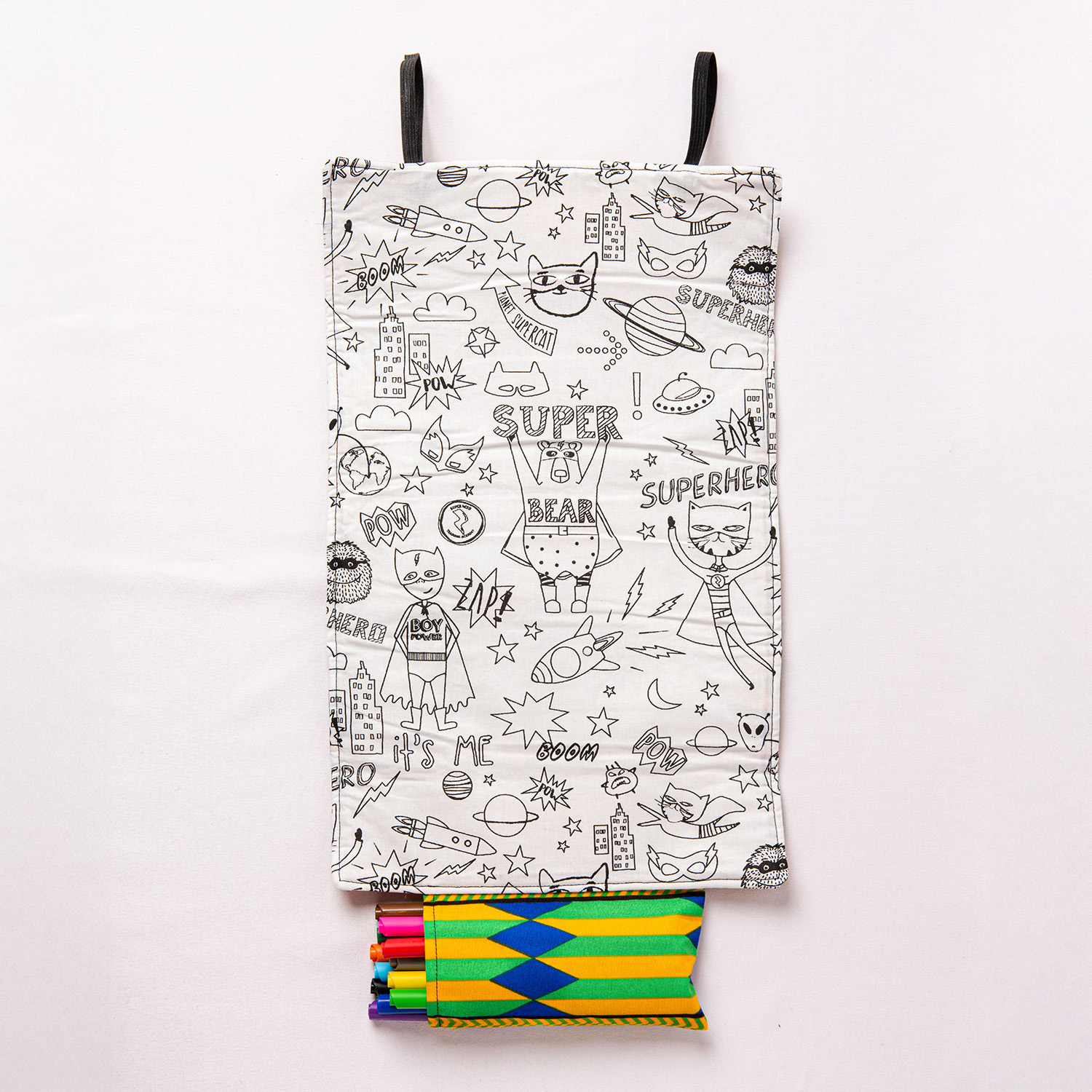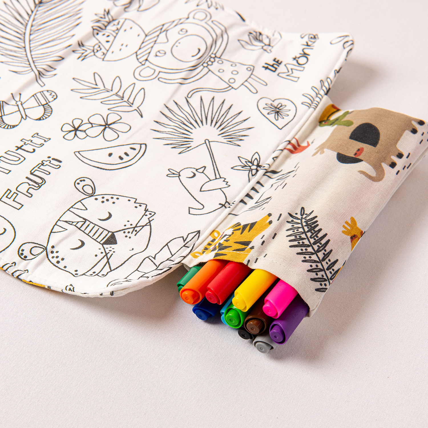 Tovaglietta in stoffa da colorare munita di astuccio contenente 12 pennarelli Faber-Castell ultra lavabili! Quando viene finita di colorare si può mettere in lavatrice con panni colorati e acchiappacolore e si riutilizza all’infinito.